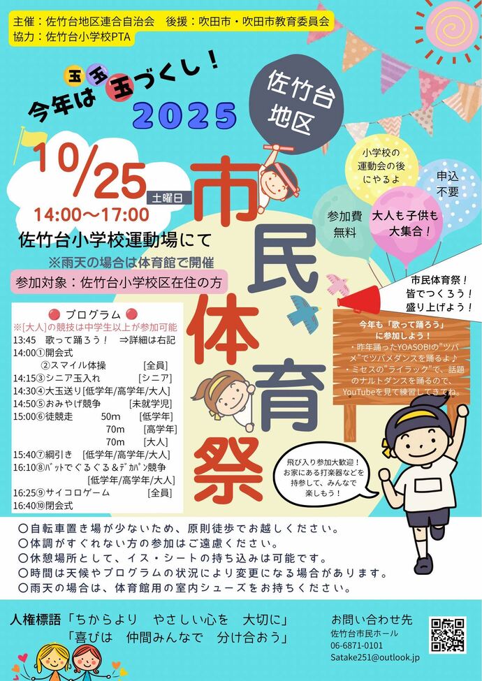 30 | 佐竹台 | 10月25日(土曜日) | 13時~17時 | 雨天時体育館 | 佐竹台小学校運動場 |