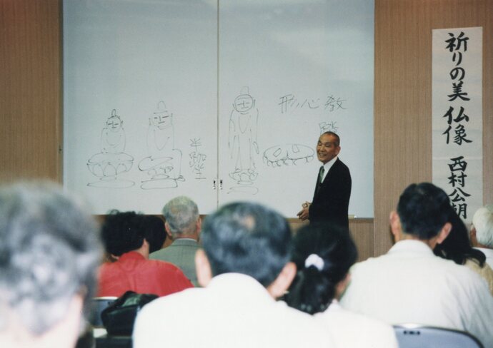西村公朝は、美術院(現財団法人美術院国宝修理所)の仏像修理技術者として、三十三間堂木造千手観音立像1,001体をはじめ、生涯で1,300体の国宝や重要文化財の仏像を修理した人物です。昭和34年(1959)には美術院国宝修理所所長となった一方、僧侶、仏像彫刻家であり、さらに仏教や仏像に関する著作を数多く手がけるなど、仏教美術史において大きな功績を残しました。