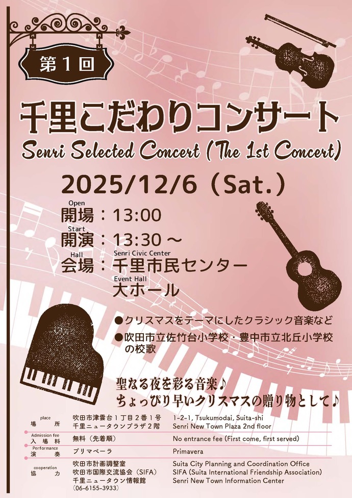 令和7年12月6日(土曜日) 千里市民センター大ホールで開催。 開場 13時00分 開演 13時30分~